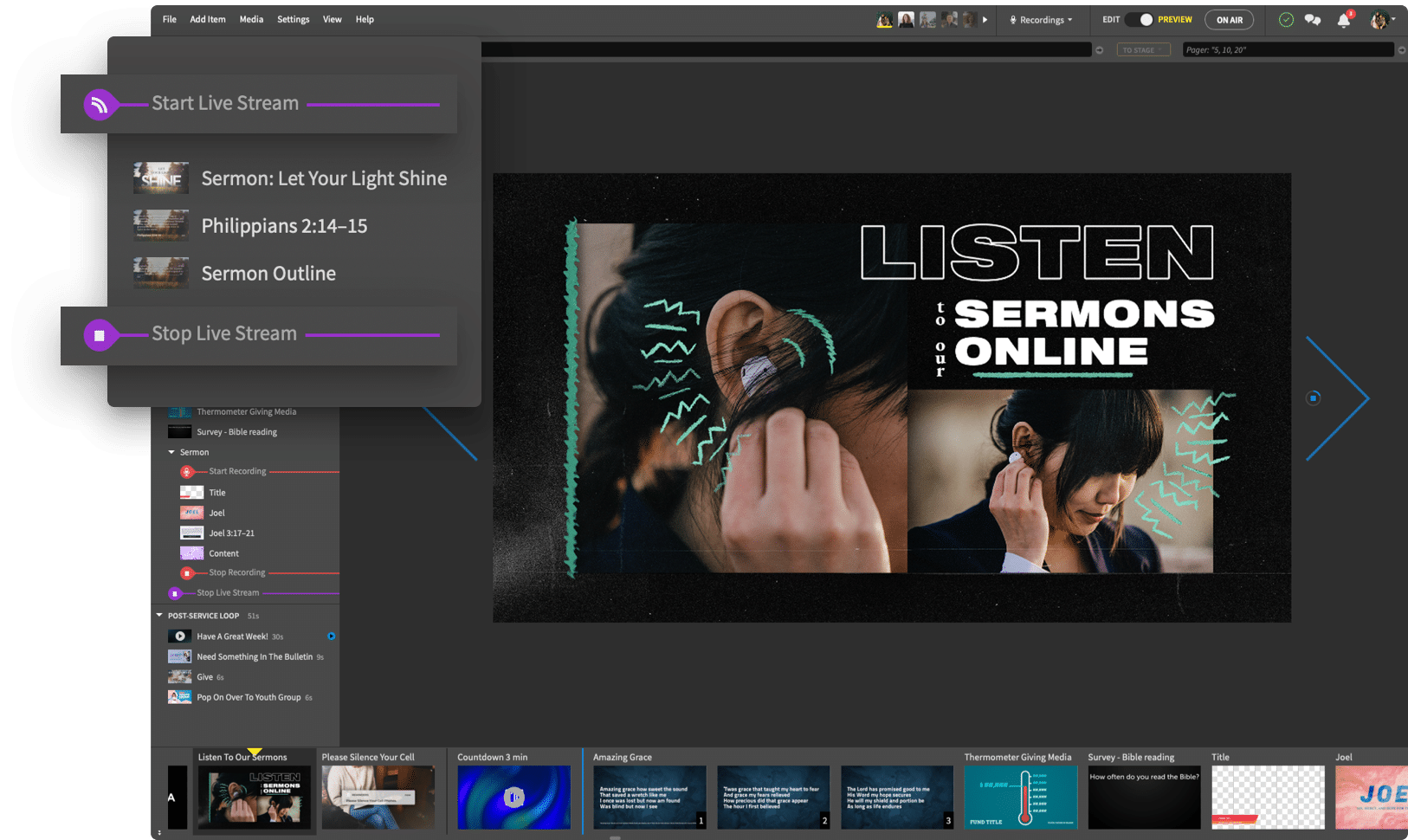 Try various slide backgrounds and Proclaim will automatically adjust the lyrics to elegantly display using Smart Media. Your single Faithlife account signs you in to all our sites. Add a custom item.